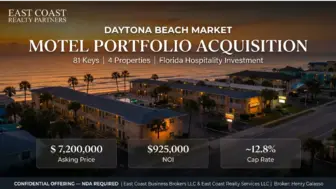 Daytona Beach Area Motel Portfolio 81 Keys | Strong Cash Flow | Florida Hospitality Investment Asking Price: $7,200,000 NOI: Approximately $925,000 Total Units: 81 Keys Location: Daytona Beach Market...